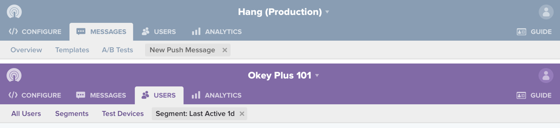 Whenever a user clicked a top level tab, the first sub-tab opened by default. This tab was the most common action people wanted to take, while other, less-used features were in other sub-tabs. Second level sub-tabs had a similar left to right layout based on frequency of use and sophistication, with the leftmost sub-tab being default and the tab users used most. This also gave us room to add in temporary tabs to represent your active work, like New Push Message and Segment: Last Active 1d above.