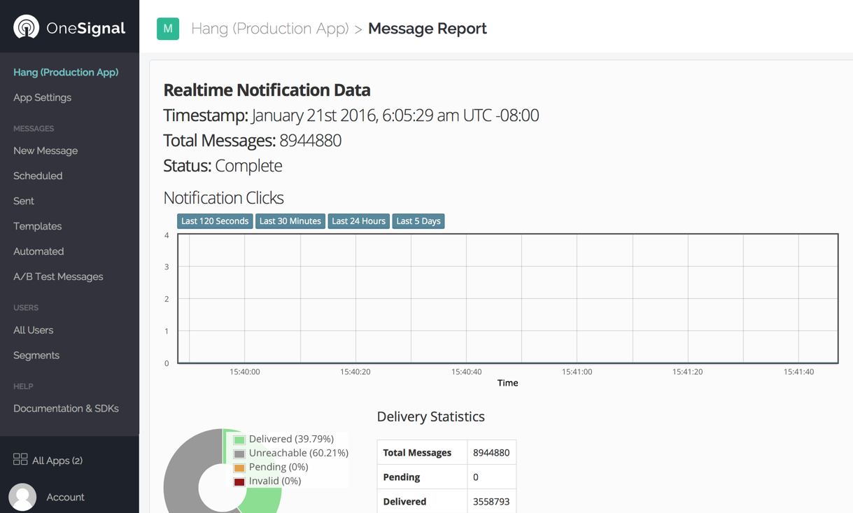 OneSignal is the leading push notification service on the market, with ~1mm users across ~500k apps and about 3.7% of internet sites. During my time there I ran product and design, and one of the main challenges I faced was how to help the product mature from its early developer-oriented roots into a full-featured marketing suite.