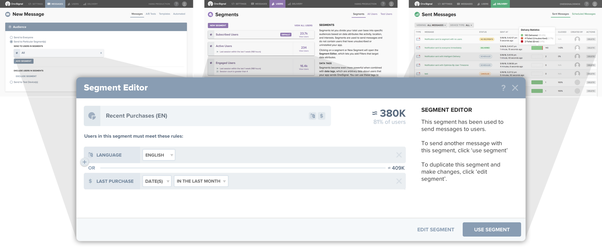 - Configure - Before messages could be sent, developers needed to set up OneSignal. Users here were technical.